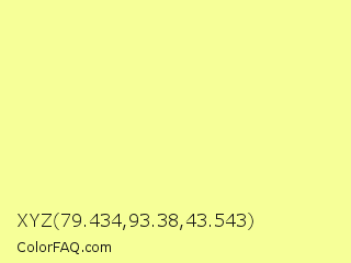 XYZ 79.434,93.38,43.543 Color is a light yellow color and the nearest color is Texas #f8f99c. Hex code #f6ff98 and RGB value is rgb(246,255,152). In RGB color space, this color is composed of 96% red, 100% green, 60% blue, In CMYK color space, this color is composed of 4% cyan, 0% magenta, 40% yellow , 0% black , In HSL color space, this color has a hue angle of 65° , 100% saturation and 80% lightness.