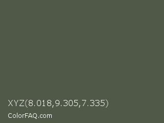 XYZ 8.018,9.305,7.335 Color is a normal green color and the nearest color is Fuscous Gray #54534d. Hex code #505947 and RGB value is rgb(80,89,71). In RGB color space, this color is composed of 31% red, 35% green, 28% blue, In CMYK color space, this color is composed of 10% cyan, 0% magenta, 20% yellow , 65% black , In HSL color space, this color has a hue angle of 90° , 11% saturation and 31% lightness.