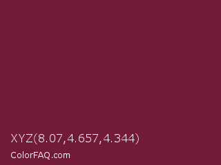 XYZ 8.07,4.657,4.344 Color is a dark rose color and the nearest color is Claret #7f1734. Hex code #721b39 and RGB value is rgb(114,27,57). In RGB color space, this color is composed of 45% red, 11% green, 22% blue, In CMYK color space, this color is composed of 0% cyan, 76% magenta, 50% yellow , 55% black , In HSL color space, this color has a hue angle of 339° , 62% saturation and 28% lightness.