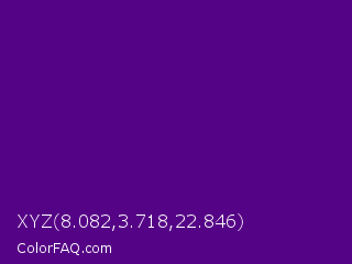 XYZ 8.082,3.718,22.846 Color is a dark purple color and the nearest color is Pigment Indigo #4b0082. Hex code #550386 and RGB value is rgb(85,3,134). In RGB color space, this color is composed of 33% red, 1% green, 53% blue, In CMYK color space, this color is composed of 37% cyan, 98% magenta, 0% yellow , 47% black , In HSL color space, this color has a hue angle of 278° , 96% saturation and 27% lightness.