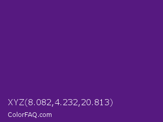 XYZ 8.082,4.232,20.813 Color is a dark purple color and the nearest color is Honey Flower #4f1c70. Hex code #561980 and RGB value is rgb(86,25,128). In RGB color space, this color is composed of 34% red, 10% green, 50% blue, In CMYK color space, this color is composed of 33% cyan, 80% magenta, 0% yellow , 50% black , In HSL color space, this color has a hue angle of 276° , 67% saturation and 30% lightness.