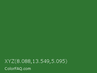 XYZ 8.088,13.549,5.095 Color is a normal green color and the nearest color is Mughal Green #306030. Hex code #2f7531 and RGB value is rgb(47,117,49). In RGB color space, this color is composed of 18% red, 46% green, 19% blue, In CMYK color space, this color is composed of 60% cyan, 0% magenta, 58% yellow , 54% black , In HSL color space, this color has a hue angle of 122° , 43% saturation and 32% lightness.