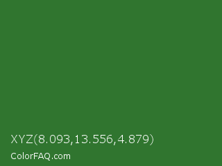 XYZ 8.093,13.556,4.879 Color is a normal green color and the nearest color is Mughal Green #306030. Hex code #30752f and RGB value is rgb(48,117,47). In RGB color space, this color is composed of 19% red, 46% green, 18% blue, In CMYK color space, this color is composed of 59% cyan, 0% magenta, 60% yellow , 54% black , In HSL color space, this color has a hue angle of 119° , 43% saturation and 32% lightness.