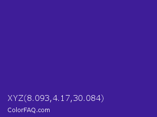 XYZ 8.093,4.17,30.084 Color is a normal indigo color and the nearest color is Daisy Bush #4f2398. Hex code #3e1d98 and RGB value is rgb(62,29,152). In RGB color space, this color is composed of 24% red, 11% green, 60% blue, In CMYK color space, this color is composed of 59% cyan, 81% magenta, 0% yellow , 40% black , In HSL color space, this color has a hue angle of 256° , 68% saturation and 35% lightness.