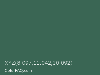 XYZ 8.097,11.042,10.092 Color is a normal green color and the nearest color is Mineral Green #3f5d53. Hex code #3a6654 and RGB value is rgb(58,102,84). In RGB color space, this color is composed of 23% red, 40% green, 33% blue, In CMYK color space, this color is composed of 43% cyan, 0% magenta, 18% yellow , 60% black , In HSL color space, this color has a hue angle of 155° , 28% saturation and 31% lightness.