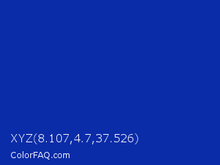 XYZ 8.107,4.7,37.526 Color is a normal blue color and the nearest color is Egyptian Blue #1034a6. Hex code #0b2ca8 and RGB value is rgb(11,44,168). In RGB color space, this color is composed of 4% red, 17% green, 66% blue, In CMYK color space, this color is composed of 93% cyan, 74% magenta, 0% yellow , 34% black , In HSL color space, this color has a hue angle of 227° , 88% saturation and 35% lightness.