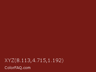 XYZ 8.113,4.715,1.192 Color is a dark red color and the nearest color is Moccaccino #6e1d14. Hex code #771a15 and RGB value is rgb(119,26,21). In RGB color space, this color is composed of 47% red, 10% green, 8% blue, In CMYK color space, this color is composed of 0% cyan, 78% magenta, 82% yellow , 53% black , In HSL color space, this color has a hue angle of 3° , 70% saturation and 27% lightness.