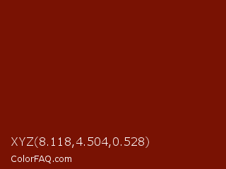 XYZ 8.118,4.504,0.528 Color is a dark red color and the nearest color is Dark Burgundy #770f05. Hex code #791203 and RGB value is rgb(121,18,3). In RGB color space, this color is composed of 47% red, 7% green, 1% blue, In CMYK color space, this color is composed of 0% cyan, 85% magenta, 98% yellow , 53% black , In HSL color space, this color has a hue angle of 8° , 95% saturation and 24% lightness.
