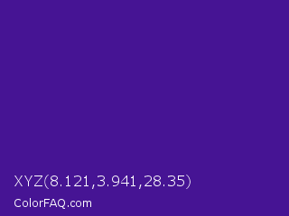 XYZ 8.121,3.941,28.35 Color is a normal violet color and the nearest color is Daisy Bush #4f2398. Hex code #461494 and RGB value is rgb(70,20,148). In RGB color space, this color is composed of 27% red, 8% green, 58% blue, In CMYK color space, this color is composed of 53% cyan, 86% magenta, 0% yellow , 42% black , In HSL color space, this color has a hue angle of 263° , 76% saturation and 33% lightness.