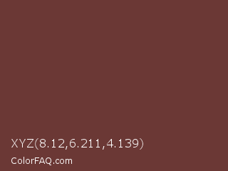 XYZ 8.12,6.211,4.139 Color is a normal red color and the nearest color is Wine #722f37. Hex code #6b3835 and RGB value is rgb(107,56,53). In RGB color space, this color is composed of 42% red, 22% green, 21% blue, In CMYK color space, this color is composed of 0% cyan, 48% magenta, 50% yellow , 58% black , In HSL color space, this color has a hue angle of 3° , 34% saturation and 31% lightness.