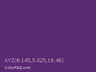 XYZ 8.145,5.025,16.46 Color is a dark purple color and the nearest color is Imperial #602f6b. Hex code #5b2972 and RGB value is rgb(91,41,114). In RGB color space, this color is composed of 36% red, 16% green, 45% blue, In CMYK color space, this color is composed of 20% cyan, 64% magenta, 0% yellow , 55% black , In HSL color space, this color has a hue angle of 281° , 47% saturation and 30% lightness.