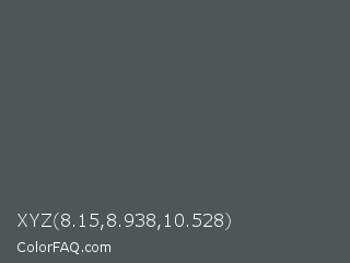 XYZ 8.15,8.938,10.528 Color is a normal cyan color and the nearest color is Abbey #4c4f56. Hex code #4d5658 and RGB value is rgb(77,86,88). In RGB color space, this color is composed of 30% red, 34% green, 35% blue, In CMYK color space, this color is composed of 13% cyan, 2% magenta, 0% yellow , 65% black , In HSL color space, this color has a hue angle of 191° , 7% saturation and 32% lightness.