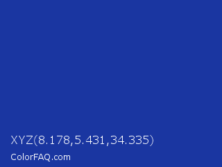 XYZ 8.178,5.431,34.335 Color is a normal blue color and the nearest color is Egyptian Blue #1034a6. Hex code #1a36a1 and RGB value is rgb(26,54,161). In RGB color space, this color is composed of 10% red, 21% green, 63% blue, In CMYK color space, this color is composed of 84% cyan, 66% magenta, 0% yellow , 37% black , In HSL color space, this color has a hue angle of 228° , 72% saturation and 37% lightness.