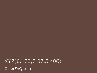 XYZ 8.178,7.37,5.406 Color is a normal red color and the nearest color is Kabul #5e483e. Hex code #63463d and RGB value is rgb(99,70,61). In RGB color space, this color is composed of 39% red, 27% green, 24% blue, In CMYK color space, this color is composed of 0% cyan, 29% magenta, 38% yellow , 61% black , In HSL color space, this color has a hue angle of 14° , 24% saturation and 31% lightness.