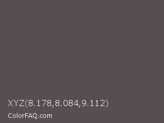 XYZ 8.178,8.084,9.112 Color is a normal rose color and the nearest color is Dark Liver #534b4f. Hex code #574e52 and RGB value is rgb(87,78,82). In RGB color space, this color is composed of 34% red, 31% green, 32% blue, In CMYK color space, this color is composed of 0% cyan, 10% magenta, 6% yellow , 66% black , In HSL color space, this color has a hue angle of 333° , 5% saturation and 32% lightness.