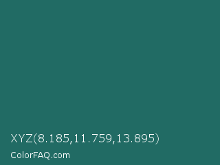 XYZ 8.185,11.759,13.895 Color is a dark cyan color and the nearest color is Genoa #15736b. Hex code #216b64 and RGB value is rgb(33,107,100). In RGB color space, this color is composed of 13% red, 42% green, 39% blue, In CMYK color space, this color is composed of 69% cyan, 0% magenta, 7% yellow , 58% black , In HSL color space, this color has a hue angle of 174° , 53% saturation and 27% lightness.