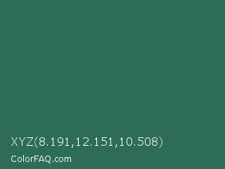 XYZ 8.191,12.151,10.508 Color is a dark green color and the nearest color is Stromboli #325d52. Hex code #2d6d55 and RGB value is rgb(45,109,85). In RGB color space, this color is composed of 18% red, 43% green, 33% blue, In CMYK color space, this color is composed of 59% cyan, 0% magenta, 22% yellow , 57% black , In HSL color space, this color has a hue angle of 158° , 42% saturation and 30% lightness.