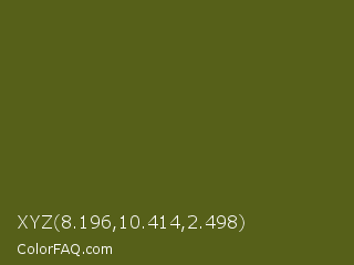 XYZ 8.196,10.414,2.498 Color is a dark yellow color and the nearest color is Saratoga #555b10. Hex code #566019 and RGB value is rgb(86,96,25). In RGB color space, this color is composed of 34% red, 38% green, 10% blue, In CMYK color space, this color is composed of 10% cyan, 0% magenta, 74% yellow , 62% black , In HSL color space, this color has a hue angle of 68° , 59% saturation and 24% lightness.