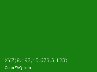 XYZ 8.197,15.673,3.123 Color is a dark green color and the nearest color is India Green #138808. Hex code #188011 and RGB value is rgb(24,128,17). In RGB color space, this color is composed of 9% red, 50% green, 7% blue, In CMYK color space, this color is composed of 81% cyan, 0% magenta, 87% yellow , 50% black , In HSL color space, this color has a hue angle of 116° , 77% saturation and 28% lightness.