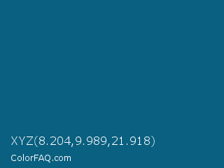 XYZ 8.204,9.989,21.918 Color is a dark blue color and the nearest color is Blue Sapphire #126180. Hex code #0a6080 and RGB value is rgb(10,96,128). In RGB color space, this color is composed of 4% red, 38% green, 50% blue, In CMYK color space, this color is composed of 92% cyan, 25% magenta, 0% yellow , 50% black , In HSL color space, this color has a hue angle of 196° , 86% saturation and 27% lightness.