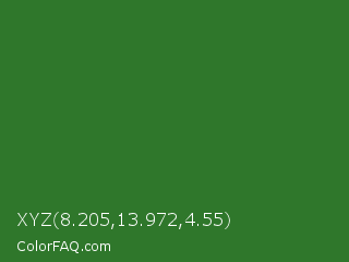 XYZ 8.205,13.972,4.55 Color is a normal green color and the nearest color is Mughal Green #306030. Hex code #2f772b and RGB value is rgb(47,119,43). In RGB color space, this color is composed of 18% red, 47% green, 17% blue, In CMYK color space, this color is composed of 61% cyan, 0% magenta, 64% yellow , 53% black , In HSL color space, this color has a hue angle of 117° , 47% saturation and 32% lightness.