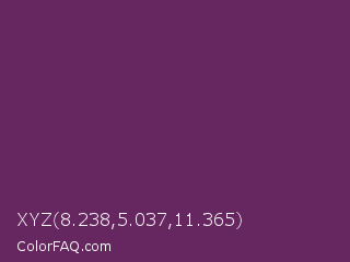 XYZ 8.238,5.037,11.365 Color is a dark magenta color and the nearest color is Palatinate Purple #682860. Hex code #66265f and RGB value is rgb(102,38,95). In RGB color space, this color is composed of 40% red, 15% green, 37% blue, In CMYK color space, this color is composed of 0% cyan, 63% magenta, 7% yellow , 60% black , In HSL color space, this color has a hue angle of 307° , 46% saturation and 27% lightness.