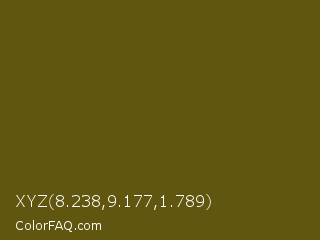 XYZ 8.238,9.177,1.789 Color is a very dark yellow color and the nearest color is West Coast #625119. Hex code #60560f and RGB value is rgb(96,86,15). In RGB color space, this color is composed of 38% red, 34% green, 6% blue, In CMYK color space, this color is composed of 0% cyan, 10% magenta, 84% yellow , 62% black , In HSL color space, this color has a hue angle of 53° , 73% saturation and 22% lightness.