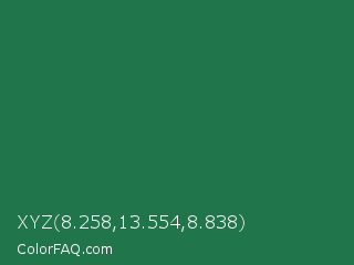 XYZ 8.258,13.554,8.838 Color is a dark green color and the nearest color is Dark Spring Green #177245. Hex code #21754b and RGB value is rgb(33,117,75). In RGB color space, this color is composed of 13% red, 46% green, 29% blue, In CMYK color space, this color is composed of 72% cyan, 0% magenta, 36% yellow , 54% black , In HSL color space, this color has a hue angle of 150° , 56% saturation and 29% lightness.
