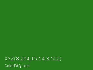 XYZ 8.294,15.14,3.522 Color is a dark green color and the nearest color is Bilbao #327c14. Hex code #257d1b and RGB value is rgb(37,125,27). In RGB color space, this color is composed of 15% red, 49% green, 11% blue, In CMYK color space, this color is composed of 70% cyan, 0% magenta, 78% yellow , 51% black , In HSL color space, this color has a hue angle of 114° , 64% saturation and 30% lightness.
