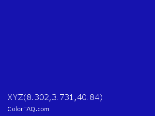 XYZ 8.302,3.731,40.84 Color is a normal indigo color and the nearest color is Zaffre #0014a8. Hex code #1613af and RGB value is rgb(22,19,175). In RGB color space, this color is composed of 9% red, 7% green, 69% blue, In CMYK color space, this color is composed of 87% cyan, 89% magenta, 0% yellow , 31% black , In HSL color space, this color has a hue angle of 241° , 80% saturation and 38% lightness.