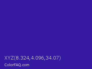 XYZ 8.324,4.096,34.07 Color is a normal indigo color and the nearest color is Blue Gem #2c0e8c. Hex code #361aa1 and RGB value is rgb(54,26,161). In RGB color space, this color is composed of 21% red, 10% green, 63% blue, In CMYK color space, this color is composed of 66% cyan, 84% magenta, 0% yellow , 37% black , In HSL color space, this color has a hue angle of 252° , 72% saturation and 37% lightness.