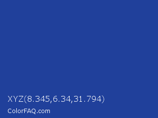 XYZ 8.345,6.34,31.794 Color is a normal blue color and the nearest color is Egyptian Blue #1034a6. Hex code #20409b and RGB value is rgb(32,64,155). In RGB color space, this color is composed of 13% red, 25% green, 61% blue, In CMYK color space, this color is composed of 79% cyan, 59% magenta, 0% yellow , 39% black , In HSL color space, this color has a hue angle of 224° , 66% saturation and 37% lightness.