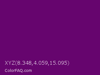 XYZ 8.348,4.059,15.095 Color is a dark magenta color and the nearest color is Patriarch #800080. Hex code #66056e and RGB value is rgb(102,5,110). In RGB color space, this color is composed of 40% red, 2% green, 43% blue, In CMYK color space, this color is composed of 7% cyan, 95% magenta, 0% yellow , 57% black , In HSL color space, this color has a hue angle of 295° , 91% saturation and 23% lightness.