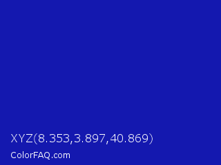 XYZ 8.353,3.897,40.869 Color is a normal blue color and the nearest color is Blue Pantone #0018a8. Hex code #1418af and RGB value is rgb(20,24,175). In RGB color space, this color is composed of 8% red, 9% green, 69% blue, In CMYK color space, this color is composed of 89% cyan, 86% magenta, 0% yellow , 31% black , In HSL color space, this color has a hue angle of 238° , 79% saturation and 38% lightness.