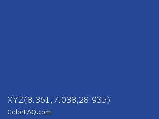 XYZ 8.361,7.038,28.935 Color is a normal blue color and the nearest color is Sapphire #2f519e. Hex code #254794 and RGB value is rgb(37,71,148). In RGB color space, this color is composed of 15% red, 28% green, 58% blue, In CMYK color space, this color is composed of 75% cyan, 52% magenta, 0% yellow , 42% black , In HSL color space, this color has a hue angle of 222° , 60% saturation and 36% lightness.