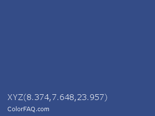 XYZ 8.374,7.648,23.957 Color is a normal blue color and the nearest color is Chambray #354e8c. Hex code #344c87 and RGB value is rgb(52,76,135). In RGB color space, this color is composed of 20% red, 30% green, 53% blue, In CMYK color space, this color is composed of 61% cyan, 44% magenta, 0% yellow , 47% black , In HSL color space, this color has a hue angle of 223° , 44% saturation and 37% lightness.