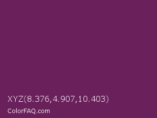 XYZ 8.376,4.907,10.403 Color is a dark magenta color and the nearest color is Palatinate Purple #682860. Hex code #6a215b and RGB value is rgb(106,33,91). In RGB color space, this color is composed of 42% red, 13% green, 36% blue, In CMYK color space, this color is composed of 0% cyan, 69% magenta, 14% yellow , 58% black , In HSL color space, this color has a hue angle of 312° , 53% saturation and 27% lightness.