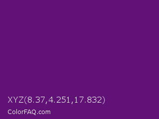 XYZ 8.37,4.251,17.832 Color is a dark purple color and the nearest color is Honey Flower #4f1c70. Hex code #601277 and RGB value is rgb(96,18,119). In RGB color space, this color is composed of 38% red, 7% green, 47% blue, In CMYK color space, this color is composed of 19% cyan, 85% magenta, 0% yellow , 53% black , In HSL color space, this color has a hue angle of 286° , 74% saturation and 27% lightness.