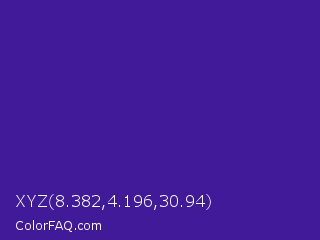 XYZ 8.382,4.196,30.94 Color is a normal indigo color and the nearest color is Daisy Bush #4f2398. Hex code #411a9a and RGB value is rgb(65,26,154). In RGB color space, this color is composed of 25% red, 10% green, 60% blue, In CMYK color space, this color is composed of 58% cyan, 83% magenta, 0% yellow , 40% black , In HSL color space, this color has a hue angle of 258° , 71% saturation and 35% lightness.