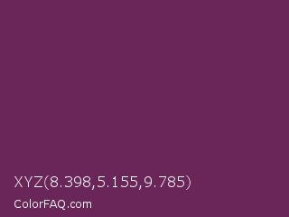 XYZ 8.398,5.155,9.785 Color is a dark magenta color and the nearest color is Finn #692d54. Hex code #6a2658 and RGB value is rgb(106,38,88). In RGB color space, this color is composed of 42% red, 15% green, 35% blue, In CMYK color space, this color is composed of 0% cyan, 64% magenta, 17% yellow , 58% black , In HSL color space, this color has a hue angle of 316° , 47% saturation and 28% lightness.