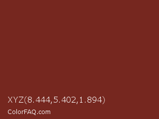 XYZ 8.444,5.402,1.894 Color is a dark red color and the nearest color is Metallic Copper #71291d. Hex code #76271f and RGB value is rgb(118,39,31). In RGB color space, this color is composed of 46% red, 15% green, 12% blue, In CMYK color space, this color is composed of 0% cyan, 67% magenta, 74% yellow , 54% black , In HSL color space, this color has a hue angle of 6° , 58% saturation and 29% lightness.