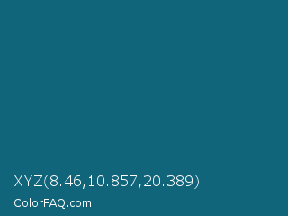 XYZ 8.46,10.857,20.389 Color is a dark cyan color and the nearest color is Blue Sapphire #126180. Hex code #11657b and RGB value is rgb(17,101,123). In RGB color space, this color is composed of 7% red, 40% green, 48% blue, In CMYK color space, this color is composed of 86% cyan, 18% magenta, 0% yellow , 52% black , In HSL color space, this color has a hue angle of 192° , 76% saturation and 27% lightness.