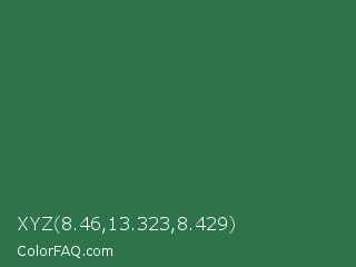 XYZ 8.46,13.323,8.429 Color is a normal green color and the nearest color is Killarney #3a6a47. Hex code #2e7349 and RGB value is rgb(46,115,73). In RGB color space, this color is composed of 18% red, 45% green, 29% blue, In CMYK color space, this color is composed of 60% cyan, 0% magenta, 37% yellow , 55% black , In HSL color space, this color has a hue angle of 143° , 43% saturation and 32% lightness.