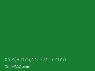 XYZ 8.475,15.571,5.465 Color is a dark green color and the nearest color is La Salle Green #087830. Hex code #167f31 and RGB value is rgb(22,127,49). In RGB color space, this color is composed of 9% red, 50% green, 19% blue, In CMYK color space, this color is composed of 83% cyan, 0% magenta, 61% yellow , 50% black , In HSL color space, this color has a hue angle of 135° , 70% saturation and 29% lightness.