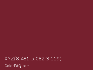 XYZ 8.481,5.082,3.119 Color is a dark red color and the nearest color is Claret #7f1734. Hex code #76202e and RGB value is rgb(118,32,46). In RGB color space, this color is composed of 46% red, 13% green, 18% blue, In CMYK color space, this color is composed of 0% cyan, 73% magenta, 61% yellow , 54% black , In HSL color space, this color has a hue angle of 350° , 57% saturation and 29% lightness.