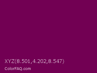 XYZ 8.501,4.202,8.547 Color is a very dark magenta color and the nearest color is Pompadour #660045. Hex code #720053 and RGB value is rgb(114,0,83). In RGB color space, this color is composed of 45% red, 0% green, 33% blue, In CMYK color space, this color is composed of 0% cyan, 100% magenta, 27% yellow , 55% black , In HSL color space, this color has a hue angle of 316° , 100% saturation and 22% lightness.