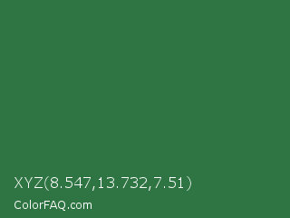 XYZ 8.547,13.732,7.51 Color is a normal green color and the nearest color is Killarney #3a6a47. Hex code #2f7543 and RGB value is rgb(47,117,67). In RGB color space, this color is composed of 18% red, 46% green, 26% blue, In CMYK color space, this color is composed of 60% cyan, 0% magenta, 43% yellow , 54% black , In HSL color space, this color has a hue angle of 137° , 43% saturation and 32% lightness.