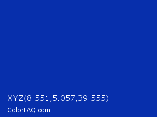 XYZ 8.551,5.057,39.555 Color is a normal blue color and the nearest color is UA Blue #0033aa. Hex code #072fac and RGB value is rgb(7,47,172). In RGB color space, this color is composed of 3% red, 18% green, 67% blue, In CMYK color space, this color is composed of 96% cyan, 73% magenta, 0% yellow , 33% black , In HSL color space, this color has a hue angle of 225° , 92% saturation and 35% lightness.
