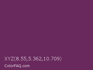 XYZ 8.55,5.362,10.709 Color is a dark magenta color and the nearest color is Palatinate Purple #682860. Hex code #69295c and RGB value is rgb(105,41,92). In RGB color space, this color is composed of 41% red, 16% green, 36% blue, In CMYK color space, this color is composed of 0% cyan, 61% magenta, 12% yellow , 59% black , In HSL color space, this color has a hue angle of 312° , 44% saturation and 29% lightness.