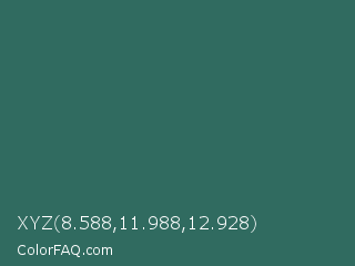 XYZ 8.588,11.988,12.928 Color is a dark cyan color and the nearest color is Casal #2f6168. Hex code #306b60 and RGB value is rgb(48,107,96). In RGB color space, this color is composed of 19% red, 42% green, 38% blue, In CMYK color space, this color is composed of 55% cyan, 0% magenta, 10% yellow , 58% black , In HSL color space, this color has a hue angle of 169° , 38% saturation and 30% lightness.